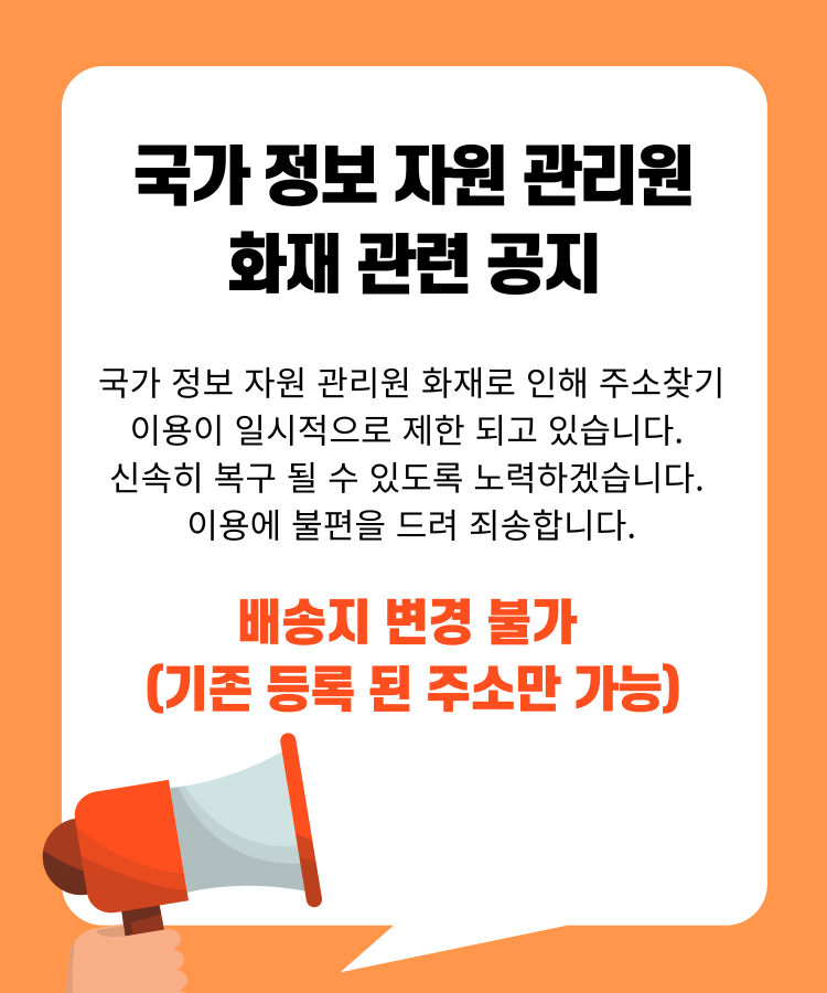 현재 국가정보자원관리원 발생한 화재로 인해 주소찾기 이용이 일시적으로 제한되고 있습니다.