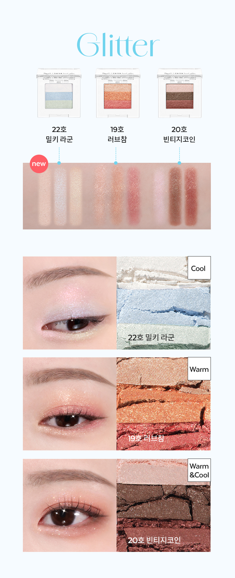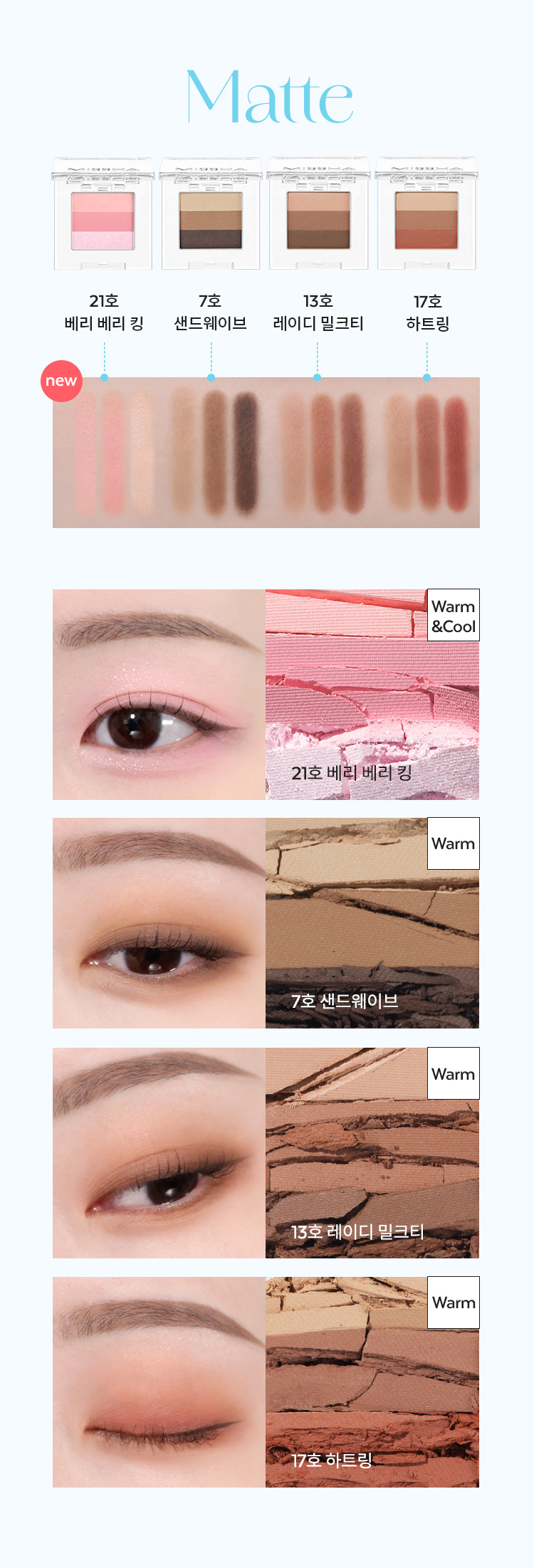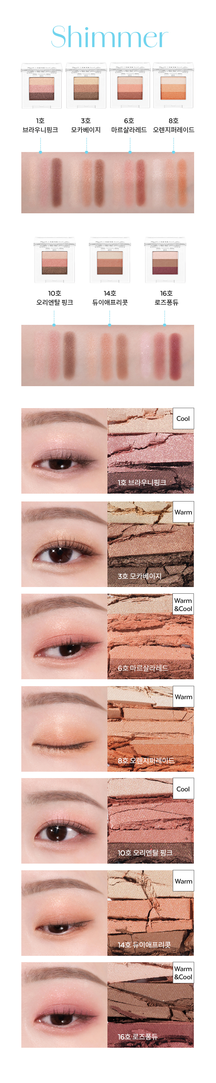 | 전성분 | [1호 브라우니 핑크 2g] 마이카,합성플루오르플로고파이트,티타늄디옥사이드,칼슘티타늄보로실리케이트,다이아이소스테아릴말레이트,옥수수전분,적색산화철,페닐트라이메티콘,미네랄오일,흑색산화철,칼슘소듐보로실리케이트,실리카,다이메티콘,마그네슘스테아레이트,다이펜타에리스리틸헥사하이드록시스테아레이트/헥사스테아레이트/헥사로지네이트,틴옥사이드,비스머스옥시클로라이드,마이크로크리스탈린왁스,다이메티콘/비닐다이메티콘크로스폴리머,클로페네신,카프릴릴글라이콜,에틸헥실글리세린,황색산화철,카민,정제수,적색226호,적색201호,아르간커넬오일,코코넛야자오일,알로에베라잎추출물,자수정가루,부틸렌글라이콜,메티콘,진주가루,글리세린,루비가루,사파이어가루,1,2-헥산다이올,하이드롤라이즈드콜라겐,페녹시에탄올,녹차추출물,다이아몬드가루,에델바이스추출물,마돈나백합꽃추출물,나팔수선화추출물,프렌치로즈꽃추출물,붉은토끼풀꽃추출물 [3호 모카 베이지 2g] 마이카,합성플루오르플로고파이트,티타늄디옥사이드,적색산화철,다이아이소스테아릴말레이트,옥수수전분,페닐트라이메티콘,미네랄오일,흑색산화철,다이메티콘,탤크,실리카,틴옥사이드,다이펜타에리스리틸헥사하이드록시스테아레이트/헥사스테아레이트/헥사로지네이트,황색산화철,마이크로크리스탈린왁스,다이메티콘/비닐다이메티콘크로스폴리머,클로페네신,정제수,카프릴릴글라이콜,마그네슘스테아레이트,에틸헥실글리세린,아르간커넬오일,적색202호,코코넛야자오일,알로에베라잎추출물,자수정가루,부틸렌글라이콜,진주가루,글리세린,루비가루,사파이어가루,1,2-헥산다이올,하이드롤라이즈드콜라겐,페녹시에탄올,녹차추출물,다이아몬드가루,에델바이스추출물,마돈나백합꽃추출물,나팔수선화추출물,프렌치로즈꽃추출물,붉은토끼풀꽃추출물 [4호 초콜릿 브라운 2g] 마이카(CI 77019), 합성플루오르플로고파이트, 티타늄디옥사이드(CI 77891), 디이소스테아릴말레이트, 흑색산화철(CI 77499), 적색산화철(CI 77491), 칼슘티타늄보로실리케이트, 옥수수전분, 페닐트리메치콘, 미네랄오일, 실리카, 디펜타에리스리틸헥사하이드록시스테아레이트/헥사스테아레이트/헥사로지네이트, 알로에베라잎추출물, 아르간트리커넬오일, 녹차추출물, 코코넛오일, 하이드롤라이즈드콜라겐, 진주가루, 에델바이스추출물, 마돈나백합꽃추출물, 나팔수선화추출물, 프렌치로즈꽃추출물, 붉은토끼풀추출물, 디메치콘, 마그네슘스테아레이트, 마이크로크리스탈린왁스, 황색산화철(CI 77492), 틴옥사이드(CI 77861), 클로페네신, 디메치콘/비닐디메치콘크로스폴리머, 카프릴릴글라이콜, 에칠헥실글리세린, 카민(CI 75470), 트로폴론 [5호 빈티지 플럼 2g] 탤크, 합성플루오르플로고파이트, 칼슘티타늄보로실리케이트, 티타늄디옥사이드(CI 77891), 마이카(CI 77019), 적색산화철(CI 77491), 옥수수전분, 트리에칠헥사노인, 프로필렌글라이콜디벤조에이트, 디이소스테아릴말레이트, 메칠메타크릴레이트크로스폴리머, 페닐트리메치콘, 디펜타에리스리틸헥사하이드록시스테아레이트/헥사스테아레이트/헥사로지네이트, 알로에베라잎추출물, 아르간트리커넬오일, 녹차추출물, 코코넛오일, 하이드롤라이즈드콜라겐, 진주가루, 에델바이스추출물, 마돈나백합꽃추출물, 나팔수선화추출물, 프렌치로즈꽃추출물, 붉은토끼풀추출물, 마그네슘스테아레이트, 실리카, 흑색산화철(CI 77499), 황색산화철(CI 77492), 클로페네신, 틴옥사이드(CI 77861), 적색202호(CI 15850:1), 카프릴릴글라이콜, 에칠헥실글리세린, 카프릴릭/카프릭트리글리세라이드, 메치콘, 적색201호(CI 15850), 알루미늄하이드록사이드 [6호 마르살라 레드 2g] 탤크,합성플루오르플로고파이트,칼슘티타늄보로실리케이트,마이카,티타늄디옥사이드,적색산화철,옥수수전분,트라이에틸헥사노인,프로필렌글라이콜다이벤조에이트,다이아이소스테아릴말레이트,메틸메타크릴레이트크로스폴리머,페닐트라이메티콘,다이펜타에리스리틸헥사하이드록시스테아레이트/헥사스테아레이트/헥사로지네이트,마그네슘스테아레이트,실리카,흑색산화철,적색226호,클로페네신,카프릴릴글라이콜,황색산화철,틴옥사이드,적색202호,에틸헥실글리세린,카프릴릭/카프릭트라이글리세라이드,메티콘,정제수,알루미늄하이드록사이드,코코넛야자오일,아르간커넬오일,알로에베라잎추출물,자수정가루,부틸렌글라이콜,진주가루,글리세린,사파이어가루,루비가루,1,2-헥산다이올,하이드롤라이즈드콜라겐,페녹시에탄올,다이아몬드가루,녹차추출물,붉은토끼풀꽃추출물,프렌치로즈꽃추출물,나팔수선화추출물,마돈나백합꽃추출물,에델바이스추출물 [7호 샌드 웨이브 2g] 탤크,합성플루오르플로고파이트,마이카,흑색산화철,옥수수전분,적색산화철,황색산화철,티타늄디옥사이드,메틸메타크릴레이트크로스폴리머,나일론-12,트라이에틸헥사노인,페닐트라이메티콘,프로필렌글라이콜다이벤조에이트,다이아이소스테아릴말레이트,다이펜타에리스리틸헥사하이드록시스테아레이트/헥사스테아레이트/헥사로지네이트,실리카,클로페네신,카
