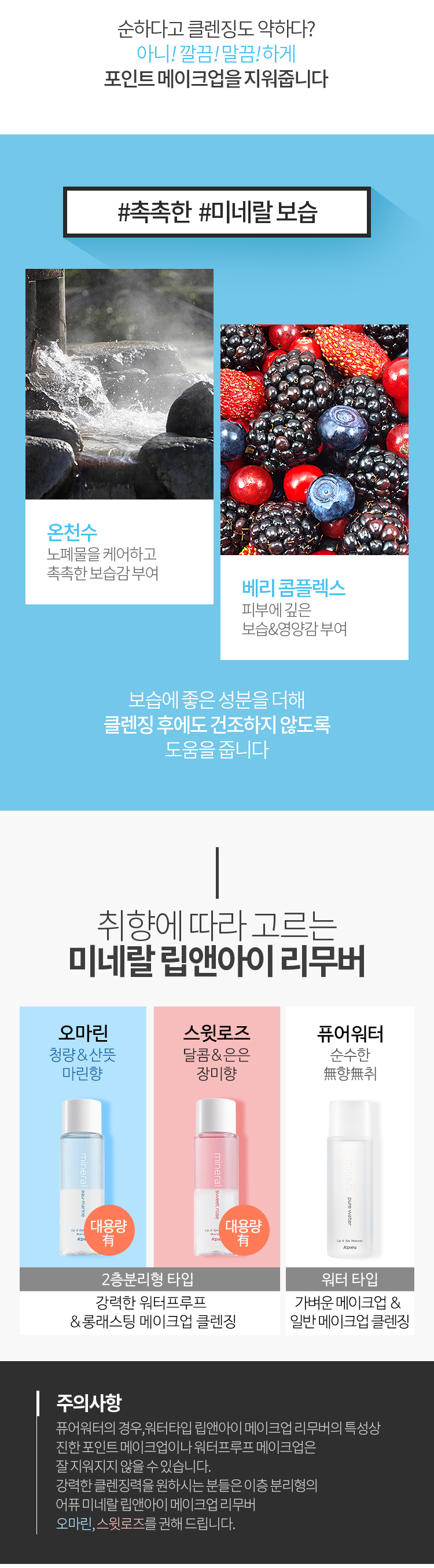 | 전성분 | 정제수, 사이클로펜타실록산, 이소헥사데칸, 디프로필렌글라이콜, 온천수, 홍화추출물, 감국추출물, 금은화추출물, 연꽃추출물, 로즈힙열매추출물, 애기수영추출물, 장미추출물, 히비스커스꽃추출물, 구기자추출물, 덩굴월귤열매추출물, 딸기추출물, 라즈베리추출물, 블랙멀베리추출물, 블랙커런트열매추출물, 블루베리추출물, 블랙베리추출물, 아사이야자추출물, 복분자추출물, 빌베리열매추출물, 마키열매추출물, 소듐클로라이드, 펜틸렌글라이콜, 카프릴릴글라이콜, 카프릴릭/카프릭트리글리세라이드, 카프릴릴/카프릴글루코사이드, 디포타슘글리시리제이트, 1,2-헥산디올, 부틸렌글라이콜, 에칠헥실글리세린, 디소듐이디티에이, 페녹시에탄올, 향료, 녹색202호 (CI 61565), 알파-이소메칠이오논, 아밀신남알, 아밀신나밀알코올, 아니스알코올, 벤질알코올, 벤질벤조에이트, 벤질신나메이트, 벤질살리실레이트, 부틸페닐메칠프로피오날, 신남알, 신나밀알코올, 시트랄, 시트로넬올, 쿠마린, 유제놀, 나무이끼추출물, 참나무이끼추출물, 파네솔, 제라니올, 헥실신남알, 하이드록시시트로넬알, 하이드록시이소헥실3-사이클로헥센카복스알데하이드, 이소유제놀, 리모넨, 리날룰, 메칠2-옥티노에이트 |