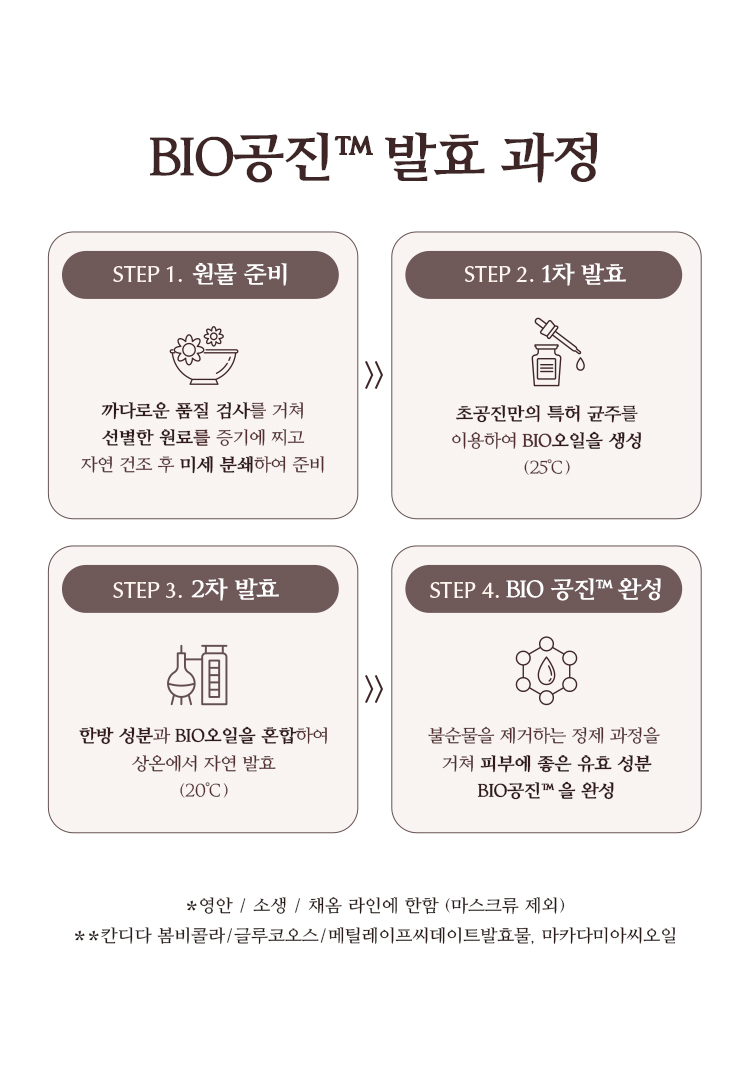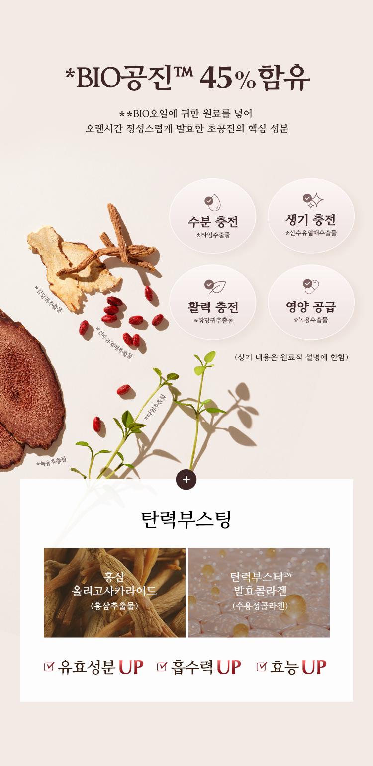 | 전성분 | 진흙버섯추출물, 부틸렌글라이콜, 글리세린, 다이프로필렌글라이콜, 펜타에리스리틸테트라에틸헥사노에이트, 정제수, 하이드로제네이티드폴리(C6-14올레핀), 네오펜틸글라이콜다이카프레이트, 나이아신아마이드, 펜틸렌글라이콜, 메틸프로판다이올, 폴리글리세릴-3메틸글루코오스다이스테아레이트, 글리세릴스테아레이트, 1,2-헥산다이올, 아이리쉬모스추출물, 사탕수수추출물, 카카오씨추출물, 인도멀구슬나무꽃추출물, 홀리바질잎추출물, 인도멀구슬나무잎추출물, 울금뿌리추출물, 홍삼추출물, 참산호말추출물, 백미꽃추출물, 접시꽃추출물, 참당귀추출물, 산수유열매추출물, 타임추출물, 해바라기씨오일, 녹용추출물, 칸디다 봄비콜라/글루코오스/메틸레이프씨데이트발효물, 수용성콜라겐, 마카다미아씨오일, 다이메티콘, 비즈왁스, 하이드록시에틸우레아, 피이지-100스테아레이트, 팔미틱애씨드, 스테아릭애씨드, C12-20알킬글루코사이드, 카프릴릴글라이콜, 트로메타민, 아데노신, 소듐파이테이트, 덱스트린, 글루코오스, 에틸헥실글리세린, 폴리글리세릴-10스테아레이트, 소듐스테아로일글루타메이트, C14-22알코올, 세테아릴알코올, 카보머, 잔탄검, 페녹시에탄올, 향료, 벤질살리실레이트, 알파-아이소메틸아이오논, 시트로넬올, 제라니올, 리날룰, 리모넨, 하이드록시시트로넬알, 헥실신남알 |
