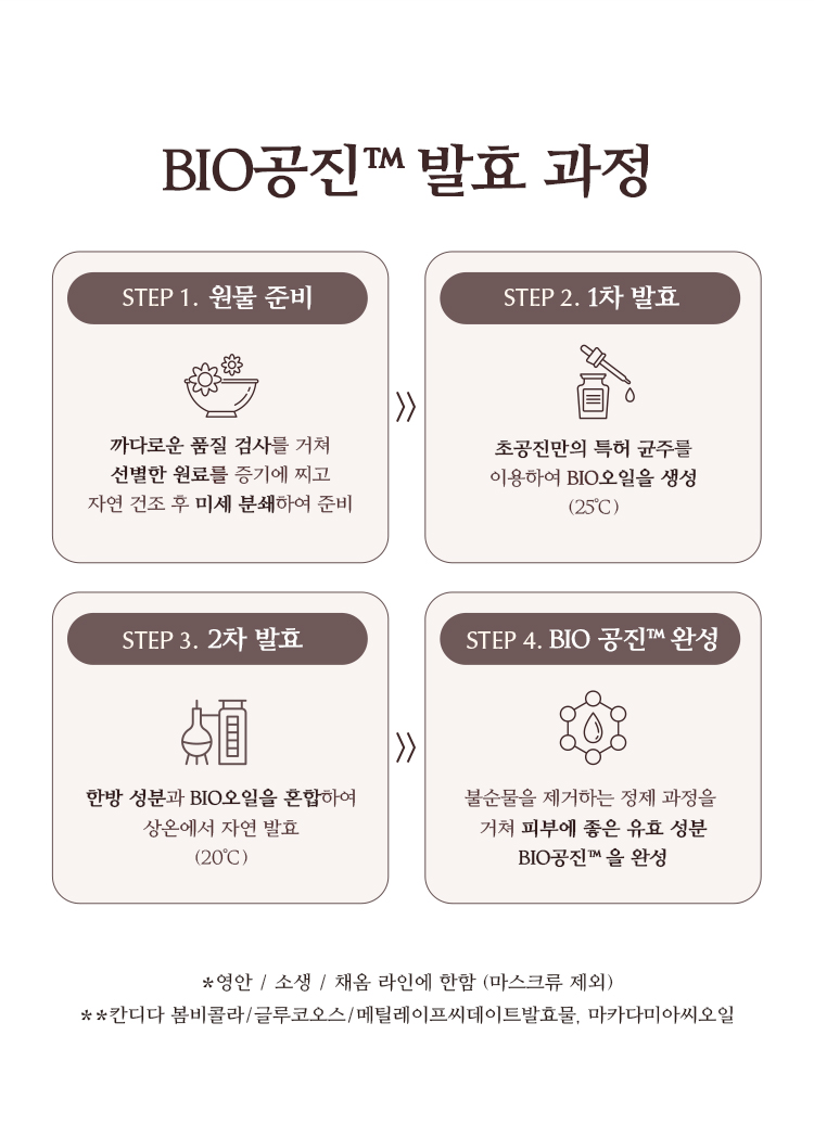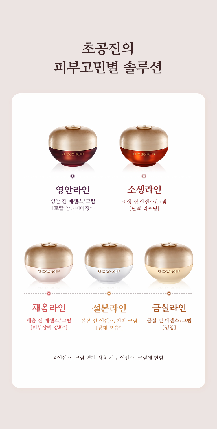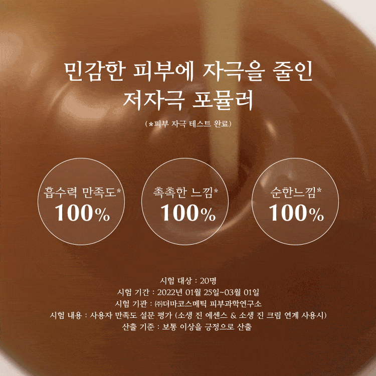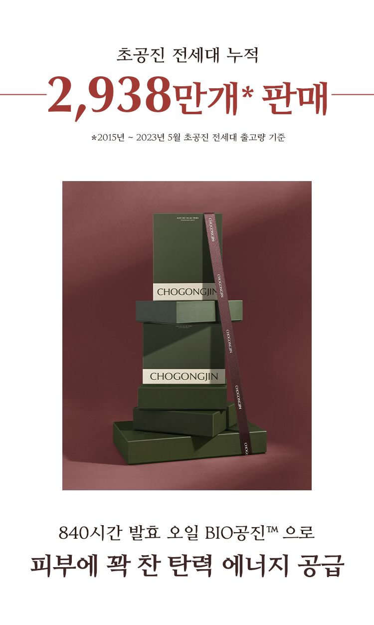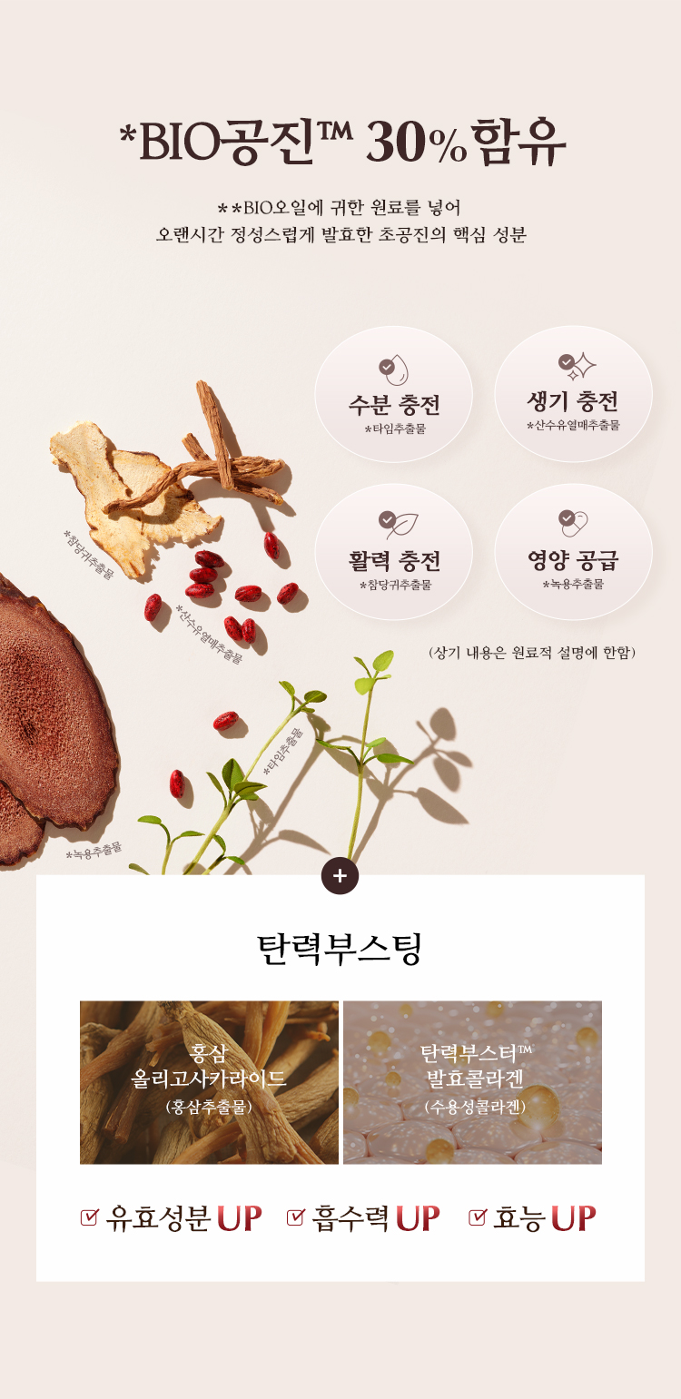| 전성분 | 정제수, 글리세린, 다이프로필렌글라이콜, 부틸렌글라이콜, 피이지-75, 변성알코올, 1,2-헥산다이올, 나이아신아마이드, 폴리글리세린-3, 펜틸렌글라이콜, 시어버터, 아이리쉬모스추출물, 진흙버섯추출물, 클로렐라 불가리스추출물, 사탕수수추출물, 인도멀구슬나무꽃추출물, 홀리바질잎추출물, 카카오추출물, 인도멀구슬나무잎추출물, 울금뿌리추출물, 하이드롤라이즈드옥수수전분, 참산호말추출물, 홍삼추출물, 참당귀추출물, 산수유열매추출물, 타임추출물, 수용성콜라겐, 녹용추출물, 해바라기씨오일, 칸디다 봄비콜라/글루코오스/메틸레이프씨데이트발효물, 마카다미아씨오일, 다이메티콘, 판테놀, 다이에톡시에틸석시네이트, 글루코오스, 피이지-60하이드로제네이티드캐스터오일, 트로메타민, 아크릴레이트/C10-30알킬아크릴레이트크로스폴리머, 프룩토올리고사카라이드, 프룩토오스, 하이드로제네이티드레시틴, 소듐폴리아크릴레이트, 글리세릴폴리아크릴레이트, 스테아레스-20, 아데노신, 덱스트린, 소듐파이테이트, 수크로오스, 베타-글루칸, 팔미토일트 라이펩타이드-5, 에틸헥실글리세린, 폴리글리세릴-10스테아레이트, 소듐스테아로일글루타메이트, 카보머, 잔탄검, 세테아릴알코올, 페녹시에탄올, 향료, 벤질살리실레이트, 알파-아이소메틸아이오논, 시트로넬올 |