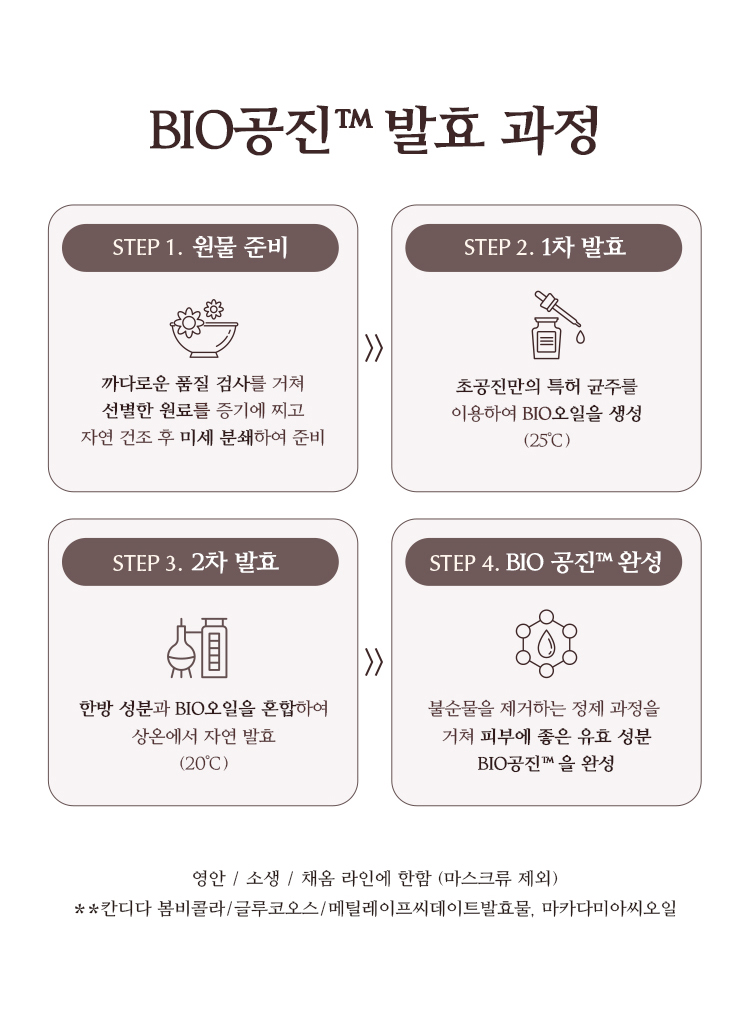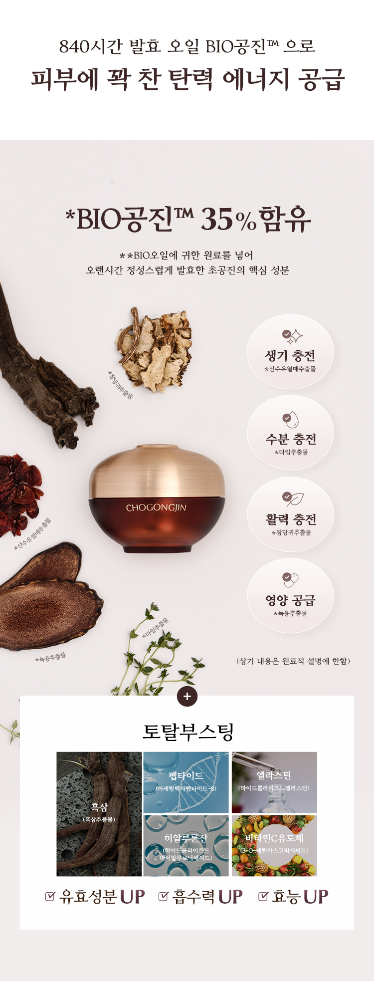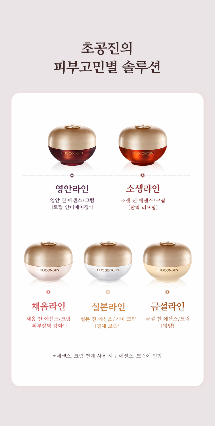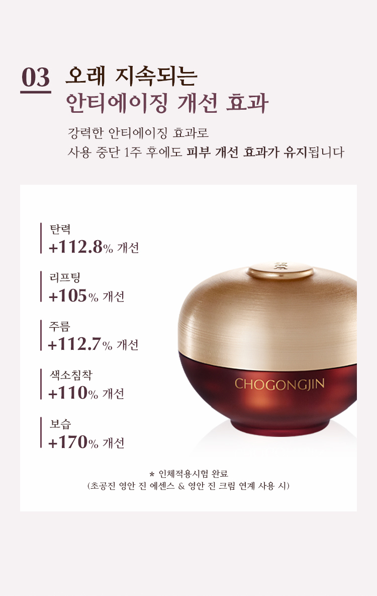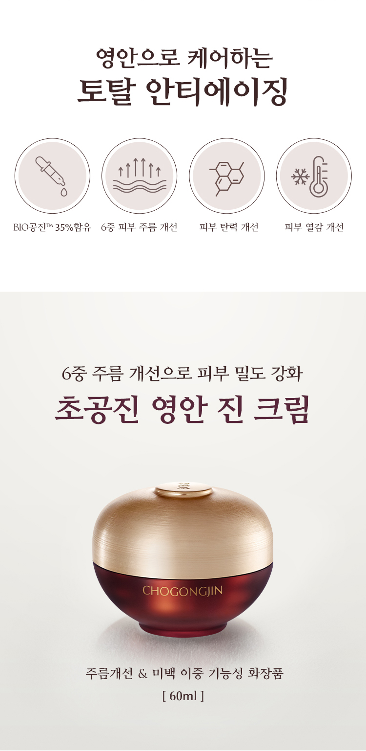 | 전성분 | 정제수, 다이프로필렌글라이콜, 다이메티콘, 사이클로펜타실록세인, 부틸렌글라이콜, 글리세린, 세테아릴알코올, 피씨에이다이메티콘, 펜틸렌글라이콜, 글리세레스-26, 나이아신아마이드, 페트롤라툼, 트라이실록세인, 글리세릴스테아레이트에스이, 진흙버섯추출물, 클로렐라 불가리스추출물, 카카오추출물, 퀸즈랜드넛오일, 백미꽃추출물, 접시꽃추출물, 참당귀추출물, 산수유열매추출물, 타임추출물, 녹용추출물, 하이드롤라이즈드하이알루로닉애씨드, 해바라기씨오일, 칸디다 봄비콜라/글루코오스/메틸레이프씨데이트발효물, 흑삼추출물, 마카다미아씨오일, 다이메티콘올, 글리세릴스테아레이트, 피이지-100스테아레이트, 암모늄아크릴로일다이메틸타우레이트/브이피코폴리머, 피이지-150다이스테아레이트, 카프릴릴글라이콜, 글루코오스, 프룩토올리고사카라이드, 프룩토오스, 덱스트린, 다이포타슘글리시리제이트, 아데노신, 1,2-헥산다이올, 소듐파이테이트, 세라마이드엔피, 피토스핑고신, 에틸헥실글리세린, 3-O-에틸아스코빅애씨드, 토코페롤, 폴리글리세릴-10스테아레이트, 메틸프로판다이올, 소듐스테아로일글루타메이트, 하이드롤라이즈드엘라스틴, 아세틸헥사펩타이드-8, 잔탄검, 비에이치티, 페녹시에탄올, 향료, 벤질살리실레이트, 알파-아이소메틸아이오논, 시트로넬올, 제라니올, 리날룰, 금 (CI 77480) |