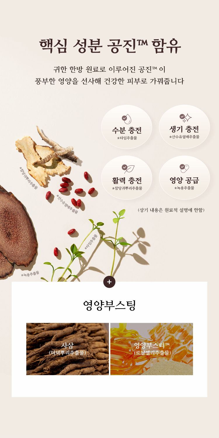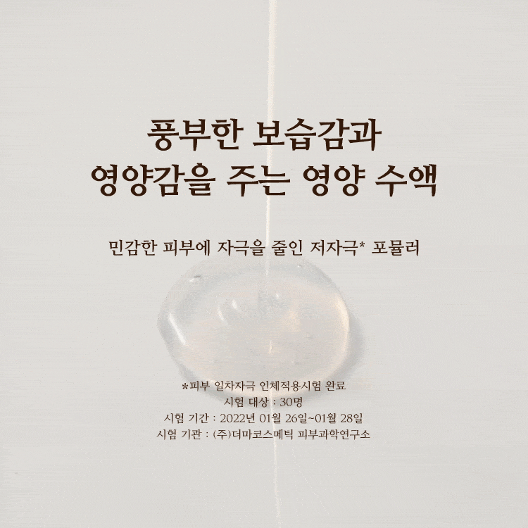 | 전성분 | 정제수,글리세린,메틸프로판다이올,1,2-헥산다이올,나이아신아마이드,비스-피이지-18메틸에터다이메틸실레인,카보머,옥틸도데세스-16,잔탄검,부틸렌글라이콜,헥실데실에틸헥사노에이트,펜타에리스리틸테트라에틸헥사노에이트,트로메타민,하이드록시아세토페논,에틸헥실글리세린,하이드로제네이티드레시틴,아데노신,다이소듐이디티에이,글리세릴폴리메타크릴레이트,향료,피브이엠/엠에이코폴리머,폴리글리세릴-10스테아레이트,베타인,소듐폴리아크릴레이트,무화과추출물,병풀추출물,줄맨드라미씨추출물,당느릅나무뿌리추출물,세라마이드엔피,더덕뿌리추출물,비에이치티,금,타임추출물,참당귀뿌리추출물,산수유열매추출물,녹용추출물,로얄젤리추출물,하이드롤라이즈드하이알루로닉애씨드,토코페롤 |