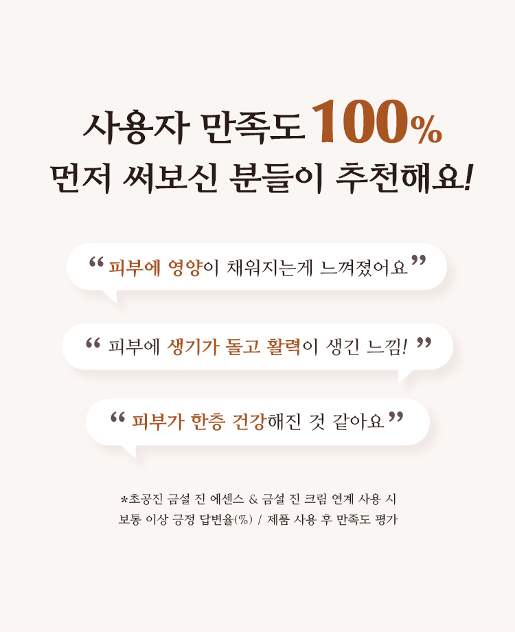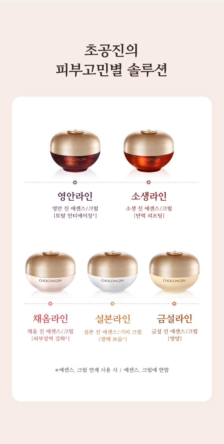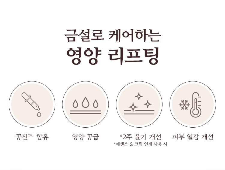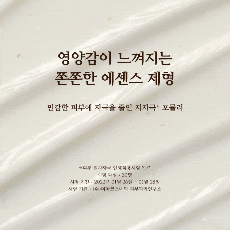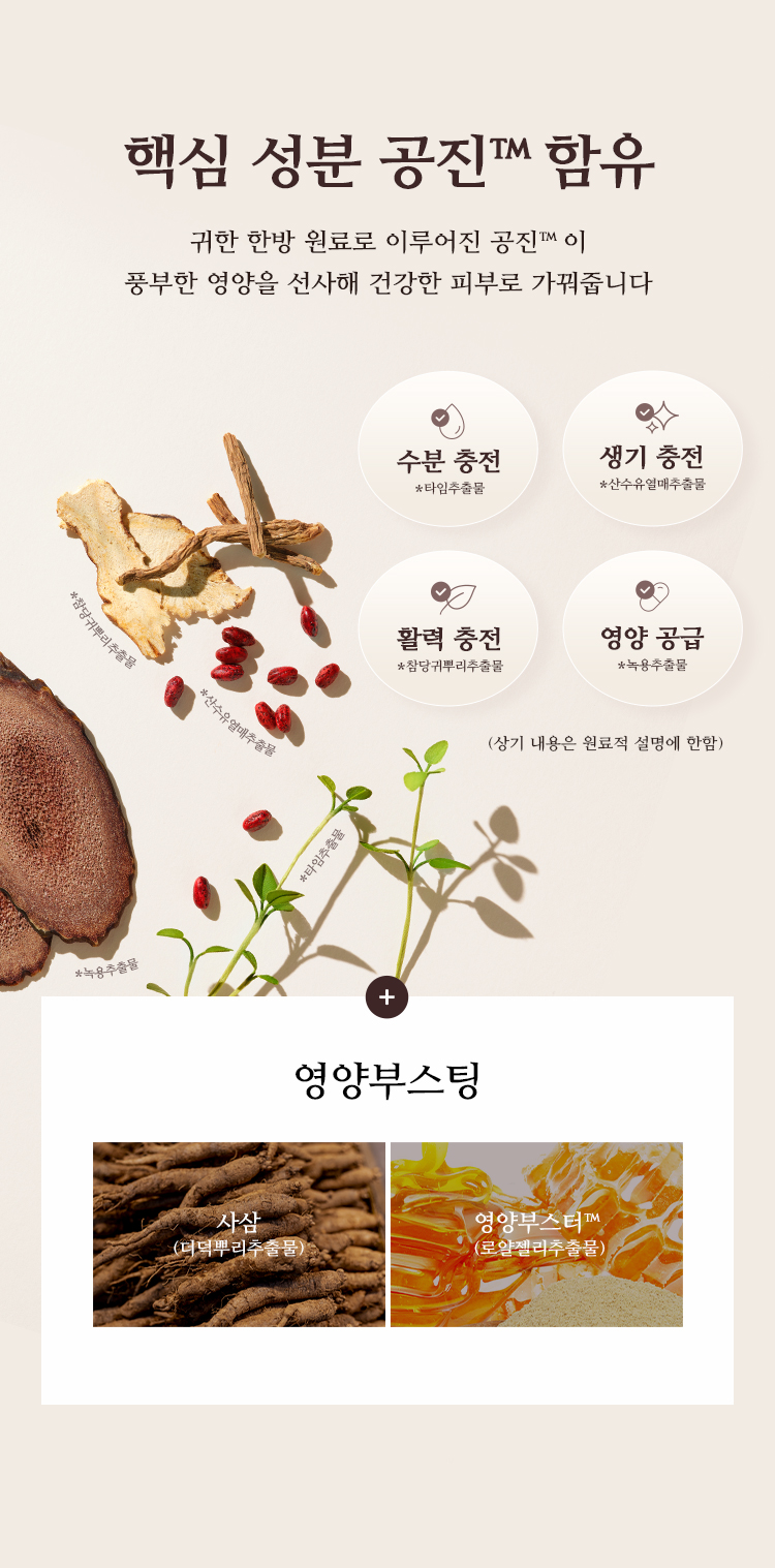 | 전성분 | 정제수, 다이프로필렌글라이콜, 글리세린, 1,2-헥산다이올, 글리세레스-26, 나이아신아마이드, 시어버터, 카프릴릭/카프릭트라이글리세라이드, 펜틸렌글라이콜, 폴리글리세릴-10스테아레이트, 폴리글리세릴-3메틸글루코오스다이스테아레이트, 하이드로제네이티드폴리(C6-14올레핀), 세테아릴알코올, 펜타에리스리틸다이스테아레이트, C12-15알킬벤조에이트, 네오펜틸글라이콜다이헵타노에이트, 메틸트라이메티콘, 판테놀, 다시마추출물, 한련초잎추출물, 귀리커넬추출물, 아티초크잎추출물, 황벽나무껍질추출물, 카카오씨추출물, 로얄젤리추출물, 더덕뿌리추출물, 녹용추출물, 산수유열매추출물, 참당귀뿌리추출물, 타임추출물, 하이드로제네이티드레시틴, 녹차수, 아르간커넬오일, 메틸프로판다이올, 아크릴레이트/C10-30알킬아크릴레이트크로스폴리머, 암모늄아크릴로일다이메틸타우레이트/브이피코폴리머, 트로메타민, 에탄올, 잔탄검, 부틸렌글라이콜, 소듐스테아로일글루타메이트, 에틸헥실글리세린, 아데노신, 프룩토올리고사카라이드, 베타-글루칸, 글리세릴폴리메타크릴레이트, 다이소듐이디티에이, 비사보롤, 폴리쿼터늄-51, 하이드롤라이즈드하이알루로닉애씨드, 금(30 ppm), 다이카프릴릴카보네이트, 덱스트린, 수크로오스다이스테아레이트, 세라마이드엔피, 토코페롤, 향료 |