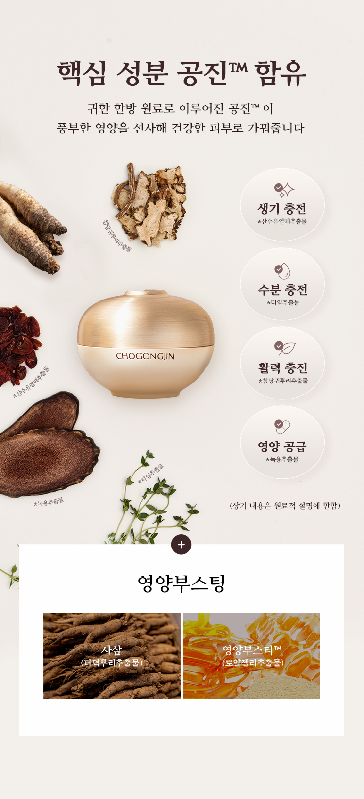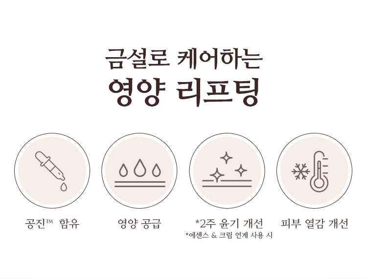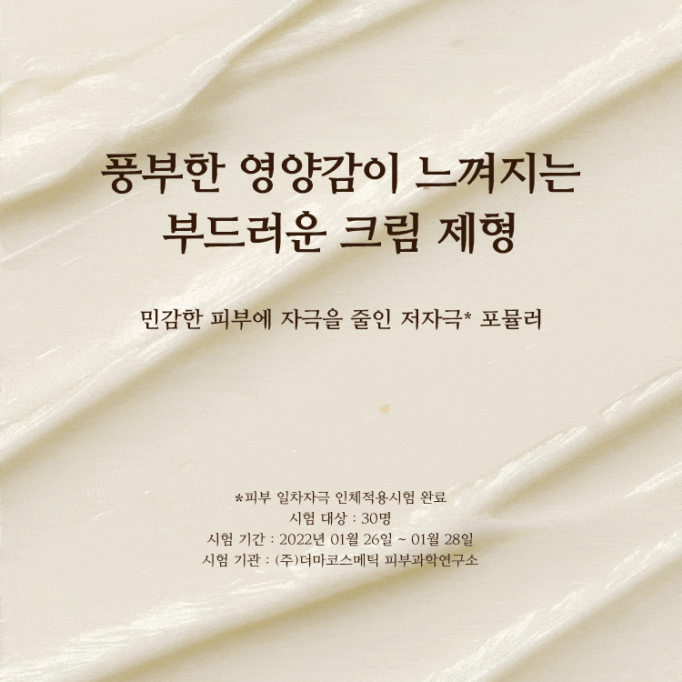 | 전성분 | 정제수, 다이프로필렌글라이콜, 글리세린, 하이드로제네이티드폴리데센, 다이카프릴릴에터, 비닐다이메티콘, 글리세릴스테아레이트, 나이아신아마이드, 다이아이소스테아릴말레이트, 베타인, 카프릴릭/카프릭트라이글리세라이드, 펜타에리스리틸테트라에틸헥사노에이트, 세테아릴알코올, 메도우폼씨오일, 트레할로오스, 아이비고드열매추출물, 한련초추출물, 황벽나무껍질추출물, 무화과추출물, 병풀추출물, 녹용추출물, 산수유열매추출물, 참당귀뿌리추출물, 타임추출물, 로얄젤리추출물, 더덕뿌리추출물, 오일팜오일, 소듐하이알루로네이트, 하이드로제네이티드레시틴, 폴리글리세릴-3다이스테아레이트, 폴리글리세릴-10라우레이트, 1,2-헥산다이올, 폴리글리세릴-6다이스테아레이트, 폴리아크릴레이트-13, 하이드록시에틸아크릴레이트/소듐아크릴로일다이메틸타우레이트코폴리머, 소듐스테아로일글루타메이트, 베헤닐알코올, 하이드록시아세토페논, 다이메티콘올, 하이드로제네이티드폴리아이소부텐, 호호바에스터, 에탄올, 에틸헥실글리세린, 세틸알코올, 잔탄검, 폴리글리세릴-3비즈왁스, 메틸프로판다이올, 솔비탄아이소스테아레이트, 부틸렌글라이콜, 글리세릴스테아레이트시트레이트, 아데노신, 다이소듐이디티에이, 에틸헥실팔미테이트, 토코페롤, 금(10 ppm), 세라마이드엔피, 향료 |