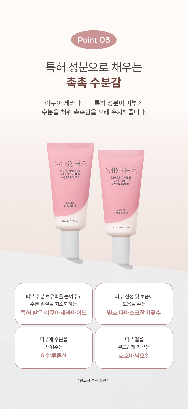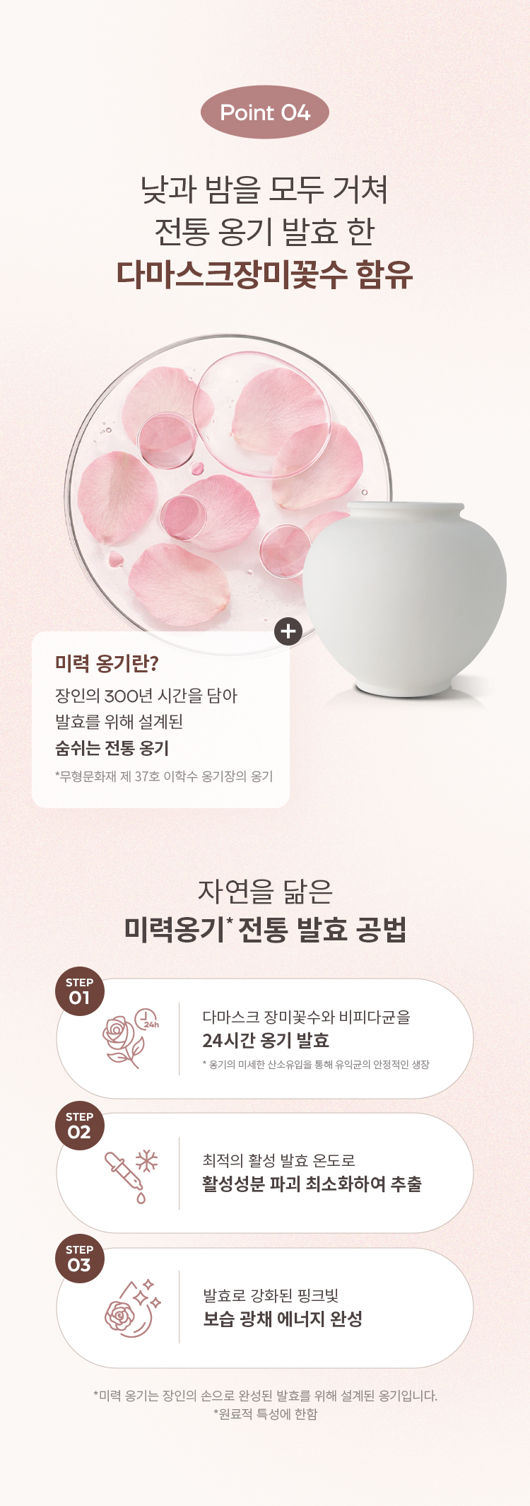 | 전성분 | 다마스크장미꽃수, 부틸렌글라이콜, 하이드로제네이티드폴리(C6-14올레핀), 스쿠알란, 다이메티콘, 글리세린, 시어버터, 카프릴릭/카프릭/미리스틱/스테아릭트라이글리세라이드, 세테아릴알코올, 나이아신아마이드, 펜틸렌글라이콜, 퀸즈랜드넛오일, 글리세릴스테아레이트, 피토스테릴/이소스테아릴/세틸/스테아릴/베헤닐다이머디리놀리에이트, 1,2-헥산다이올, 합성비즈왁스, 피이지-40스테아레이트, 카나우바왁스, 그롬웰뿌리추출물, 연꽃꽃추출물, 매실추출물, 하이드롤라이즈드오크라추출물, 화이트루핀씨추출물, 드럼스틱씨추출물, 황련뿌리추출물, 하이드롤라이즈드콜라겐, 해바라기씨오일불검화물, 호호바씨오일, 소듐하이알루로네이트, 자일리틸글루코사이드, 자일리톨, 비피다발효용해물, 정제수, 피이지-100스테아레이트, 카프릴릭/카프릭트라이글리세라이드, 피이지-30다이폴리하이드록시스테아레이트, 폴리아크릴아마이드, 소듐폴리아크릴레이트, 토코페릴아세테이트, C13-14아이소알케인, 에틸헥실코코에이트, 에틸헥실글리세린, 폴리글리세릴-6스테아레이트, 라우레스-7, 피피지-3벤질에터미리스테이트, 폴리솔베이트20, 폴리글리세릴-6베헤네이트, 토코페롤, 안하이드로자일리톨, 세라마이드엔피, 하이드로제네이티드레시틴, 글라이신, 세린, 글루타믹애씨드, 아스파틱애씨드, 류신, 알라닌, 라이신, 알지닌, 타이로신, 페닐알라닌, 프롤린, 트레오닌, 발린, 아이소류신, 히스티딘, 시스테인, 메티오닌, 다이소듐이디티에이, 향료, 리모넨, 리날룰 |