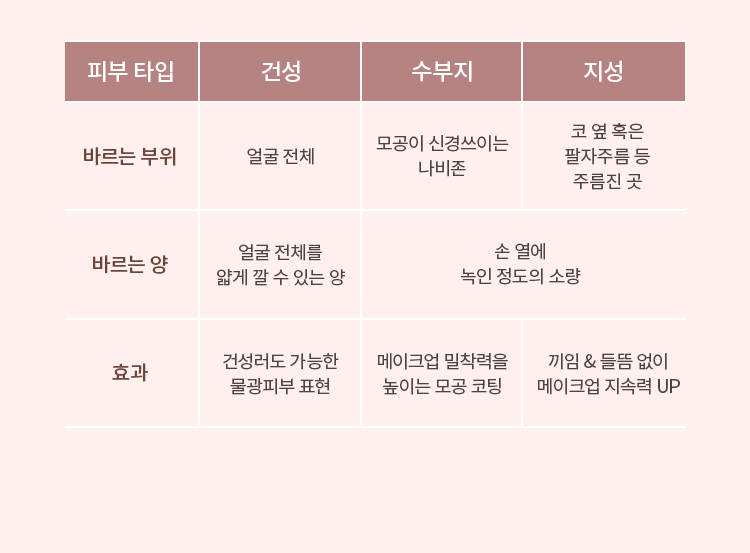 | 사용할 때의 주의사항 | 가. 화장품 사용 시 또는 사용 후 직사광선에 의하여 사용부위가 붉은 반점, 부어오름 또는 가려움증 등의 이상 증상이나 부작용이 있는 경우에는 전문의 등과 상담할 것 나. 상처가 있는 부위 등에는 사용을 자제할 것 다. 보관 및 취급 시 주의사항 1) 어린이의 손이 닿지 않는 곳에 보관할 것 2) 직사광선을 피해서 보관할 것 |