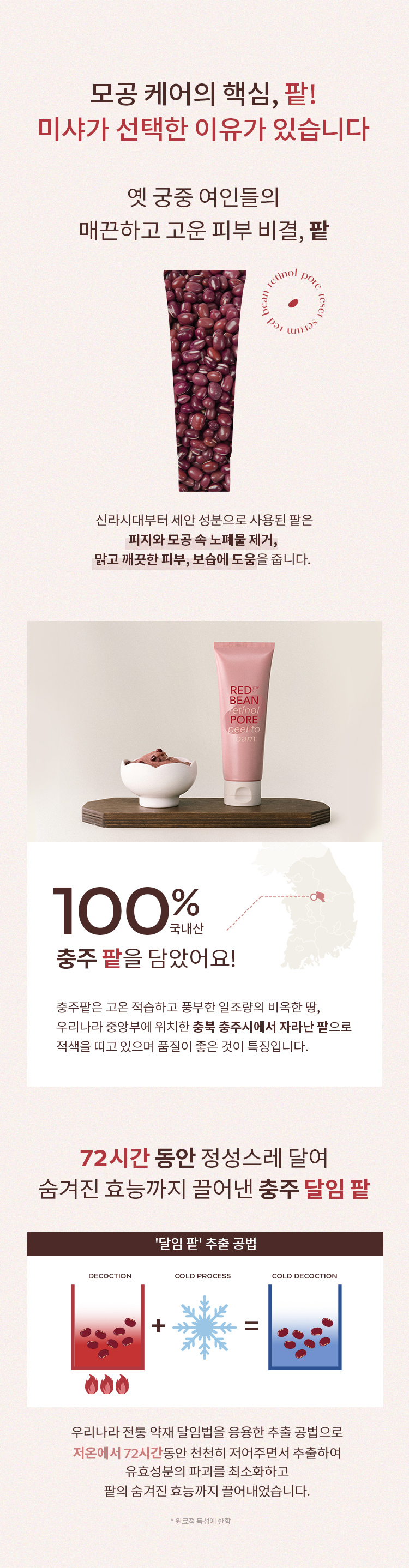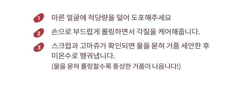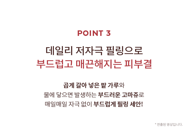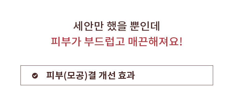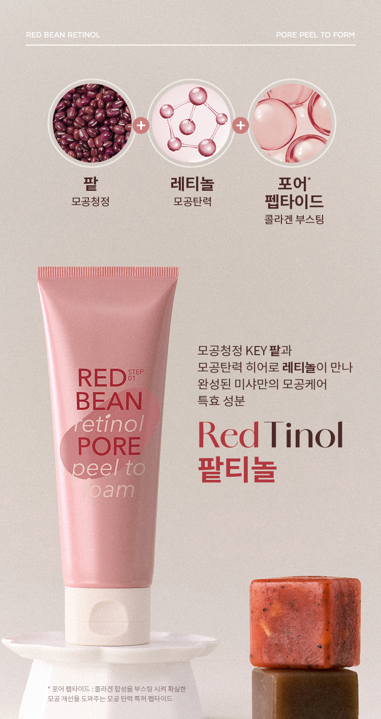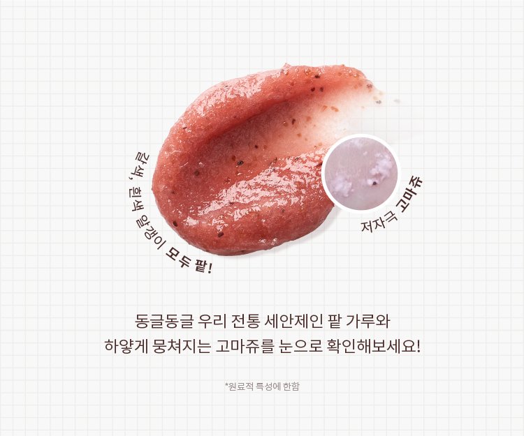 | 전성분 | 정제수, 다이소듐코코암포다이아세테이트, 코코-베타인, 셀룰로오스, 글리세린, 소듐코코일알라니네이트, 소듐라우로일메틸이세티오네이트, 소듐클로라이드, 팥가루(20,000ppm), 아크릴레이트코폴리머, 카카오씨추출물, 무화과추출물, 병풀추출물, 뽕나무뿌리추출물, 팥추출물(0.0001ppb), 로즈마리잎오일, 하이드로제네이티드레시틴, 소듐하이알루로네이트, 시트릭애씨드, 포타슘벤조에이트, 하이드록시아세토페논, 잔탄검, 헥실렌글라이콜, 덱스트린, 소듐파이테이트, 부틸렌글라이콜, 사이아노코발아민, 1,2-헥산다이올, 베타-글루칸, 세라마이드엔피, 다이프로필렌글라이콜, 하이드로제네이티드포스파티딜콜린, 카프릴로일살리실릭애씨드, 프로판다이올, 카프릴릭/카프릭트라이글리세라이드, 레티놀(1.31ppb), 콜레스테롤, 에이치디아이/트라이메틸올헥실락톤크로스폴리머, 팔미틱애씨드, 스테아릭애씨드, 폴리비닐알코올, 메틸프로판다이올, 토코페롤, 팔미토일트라이펩타이드-5, 하이드록시프로필사이클로덱스트린, 카프릴릴글라이콜, 에탄올, 하이드롤라이즈드엘라스틴, 하이드롤라이즈드콜라겐, 페닐프로판올, 수크로오스다이스테아레이트, 다이소듐이디티에이 |