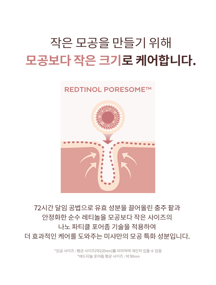 | 사용할 때의 주의사항 | 가. 화장품 사용 시 또는 사용 후 직사광선에 의하여 사용부위가 붉은 반점, 부어오름 또는 가려움증 등의 이상 증상이나 부작용이 있는 경우에는 전문의 등과 상담할 것 나. 상처가 있는 부위 등에는 사용을 자제할 것 다. 보관 및 취급 시 주의사항 1) 어린이의 손이 닿지 않는 곳에 보관할 것 2) 직사광선을 피해서 보관할 것 3) 알갱이가 눈에 들어갔을 때에는 물로 씻어내고, 이상이 있는 경우에는 전문의와 상담할 것 *레티놀 성분의 신선도 유지를 위해 고온과 직사광선을 피해서 보관해 주세요. 레티놀 성분의 특성상 색상이 진해지거나 고유의 취가 느껴질 수 있습니다. |