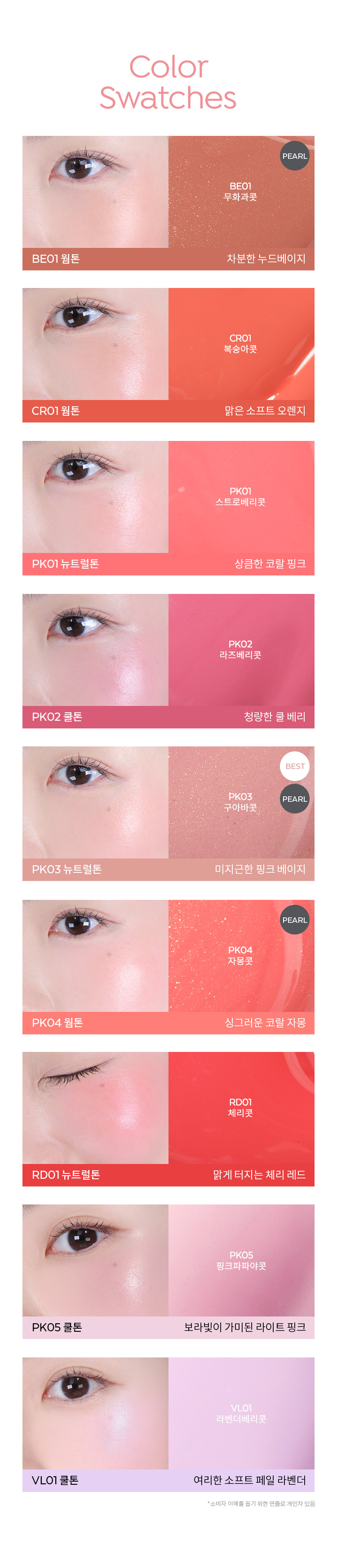 전성분 | [BE01 무화과콧] 정제수, 사이클로펜타실록산, 변성알코올, 부틸렌글라이콜, 세틸에칠헥사노에이트, 메칠트리메치콘, 탤크, 글리세린, 펜틸렌글라이콜, 피이지-10디메치콘, 트리에칠헥사노인, 합성플루오르플로고파이트, 양벚나무열매추출물, 다마스크장미꽃수, 무화과추출물, 오렌지껍질오일, 호호바씨오일, 유차나무씨오일, 블랙커민씨오일, 석류씨오일, 로즈힙열매오일, 포도추출물, 살구추출물, 블루베리추출물, 딸기추출물, 복숭아추출물, 라즈베리추출물, 메칠메타크릴레이트크로스폴리머, 폴리프로필실세스퀴옥산, 트리메칠실록시실리케이트, 마그네슘설페이트, 세틸피이지/피피지-10/1디메치콘, 디스테아디모늄헥토라이트, 디메치콘, 디메치콘크로스폴리머, 트리에톡시카프릴릴실란, 에칠헥실글리세린, 1,2-헥산디올, 카프릴릴글라이콜, 옥탄디올, 디소듐이디티에이, 페녹시에탄올, 향료, 마이카 (CI 77019), 티타늄디옥사이드 (CI 77891), 적색산화철 (CI 77491), 흑색산화철 (CI 77499), 적색226호 (CI 73360), 울트라마린 (CI 77007), 황색산화철 (CI 77492), 리날룰, 리모넨 [CR01 복숭아콧] 정제수, 사이클로펜타실록산, 변성알코올, 부틸렌글라이콜, 세틸에칠헥사노에이트, 메칠트리메치콘, 탤크, 글리세린, 펜틸렌글라이콜, 피이지-10디메치콘, 트리에칠헥사노인, 합성플루오르플로고파이트, 양벚나무열매추출물, 다마스크장미꽃수, 오렌지껍질오일, 호호바씨오일, 유차나무씨오일, 블랙커민씨오일, 석류씨오일, 로즈힙열매오일, 포도추출물, 살구추출물, 딸기추출물, 복숭아추출물, 메칠메타크릴레이트크로스폴리머, 폴리프로필실세스퀴옥산, 트리메칠실록시실리케이트, 마그네슘설페이트, 세틸피이지/피피지-10/1디메치콘, 디스테아디모늄헥토라이트, 디메치콘, 디메치콘크로스폴리머, 트리에톡시카프릴릴실란, 에칠헥실글리세린, 1,2-헥산디올, 카프릴릴글라이콜, 옥탄디올, 디소듐이디티에이, 페녹시에탄올, 향료, 마이카 (CI 77019), 황색산화철 (CI 77492), 적색226호 (CI 73360), 티타늄디옥사이드 (CI 77891), 적색산화철 (CI 77491), 흑색산화철 (CI 77499), 리날룰, 리모넨 [PK01 스트로베리콧] 정제수, 사이클로펜타실록산, 변성알코올, 부틸렌글라이콜, 세틸에칠헥사노에이트, 메칠트리메치콘, 탤크, 글리세린, 펜틸렌글라이콜, 피이지-10디메치콘, 트리에칠헥사노인, 합성플루오르플로고파이트, 양벚나무열매추출물, 다마스크장미꽃수, 오렌지껍질오일, 호호바씨오일, 유차나무씨오일, 블랙커민씨오일, 석류씨오일, 로즈힙열매오일, 포도추출물, 살구추출물, 딸기추출물, 복숭아추출물, 메칠메타크릴레이트크로스폴리머, 폴리프로필실세스퀴옥산, 트리메칠실록시실리케이트, 마그네슘설페이트, 세틸피이지/피피지-10/1디메치콘, 디스테아디모늄헥토라이트, 디메치콘, 디메치콘크로스폴리머, 트리에톡시카프릴릴실란, 에칠헥실글리세린, 1,2-헥산디올, 카프릴릴글라이콜, 옥탄디올, 디소듐이디티에이, 페녹시에탄올, 향료, 마이카 (CI 77019), 티타늄디옥사이드 (CI 77891), 적색226호 (CI 73360), 황색산화철 (CI 77492), 적색산화철 (CI 77491), 리날룰, 리모넨 [PK02 라즈베리콧] 정제수, 사이클로펜타실록산, 변성알코올, 부틸렌글라이콜, 세틸에칠헥사노에이트, 메칠트리메치콘, 탤크, 글리세린, 펜틸렌글라이콜, 피이지-10디메치콘, 트리에칠헥사노인, 합성플루오르플로고파이트, 양벚나무열매추출물, 다마스크장미꽃수, 무화과추출물, 오렌지껍질오일, 호호바씨오일, 유차나무씨오일, 블랙커민씨오일, 석류씨오일, 로즈힙열매오일, 포도추출물, 살구추출물, 블루베리추출물, 딸기추출물, 복숭아추출물, 라즈베리추출물, 메칠메타크릴레이트크로스폴리머, 폴리프로필실세스퀴옥산, 트리메칠실록시실리케이트, 마그네슘설페이트, 세틸피이지/피피지-10/1디메치콘, 디스테아디모늄헥토라이트, 디메치콘, 디메치콘크로스폴리머, 트리에톡시카프릴릴실란, 에칠헥실글리세린, 1,2-헥산디올, 카프릴릴글라이콜, 옥탄디올, 디소듐이디티에이, 페녹시에탄올, 향료, 티타늄디옥사이드 (CI 77891), 적색226호 (CI 73360), 울트라마린 (CI 77007), 황색산화철 (CI 77492), 리날룰, 리모넨 [PK03 구아바콧] 정제수, 사이클로펜타실록산, 변성알코올, 부틸렌글라이콜, 세틸에칠헥사노에이트, 메칠트리메치콘, 티타늄디옥사이드 (CI 77891), 글리세린, 펜틸렌글라이콜, 피이지-10디메치콘, 트리에칠헥사노인, 마이카 (CI 77019), 양벚나무열매추출물, 다마스크장미꽃수, 무화과추출물, 오렌지껍질오일, 호호바씨오일, 유차나무씨오일, 블랙커민씨오일, 석류씨오일, 로즈힙열매오일, 포도추출물, 살구추출물, 블루베리추출물, 딸기추출물, 복숭아추출물, 구아바추출물, 라즈베리추출물, 폴리프로필실세스퀴옥산, 트리메칠실록시실리케이트, 마그네슘설페이트, 합성플루오르플로고파이트, 세틸피이지/피피지-10/1디메치콘, 디스테아디모늄헥토라이트, 메칠메타크릴레이트크로스폴리머, 디메치콘, 디메치콘크로스폴리머, 트리에톡시카프릴릴실란, 에칠헥실글리세린, 알루미늄하이드록사이드, 1,2-헥산디올, 시트릭애씨드, 카프릴릴글라이콜, 옥탄디올, 탤크, 디소듐이디티에이, 틴옥사