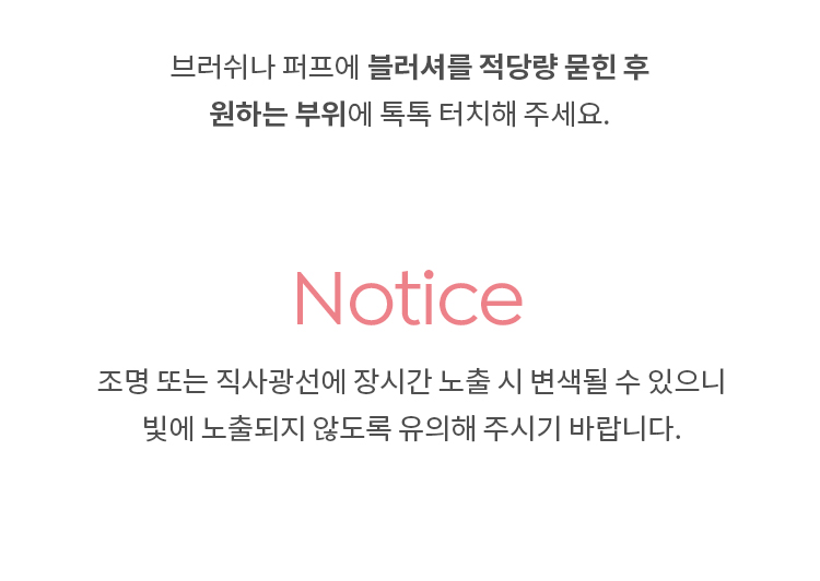 | 사용할 때의 주의사항 | 가. 화장품 사용 시 또는 사용 후 직사광선에 의하여 사용부위가 붉은 반점, 부어오름 또는 가려움증 등의 이상 증상이나 부작용이 있는 경우에는 전문의 등과 상담할 것 나. 상처가 있는 부위 등에는 사용을 자제할 것 다. 보관 및 취급 시 주의사항 1) 어린이의 손이 닿지 않는 곳에 보관할 것 2) 직사광선을 피해서 보관할 것 |
