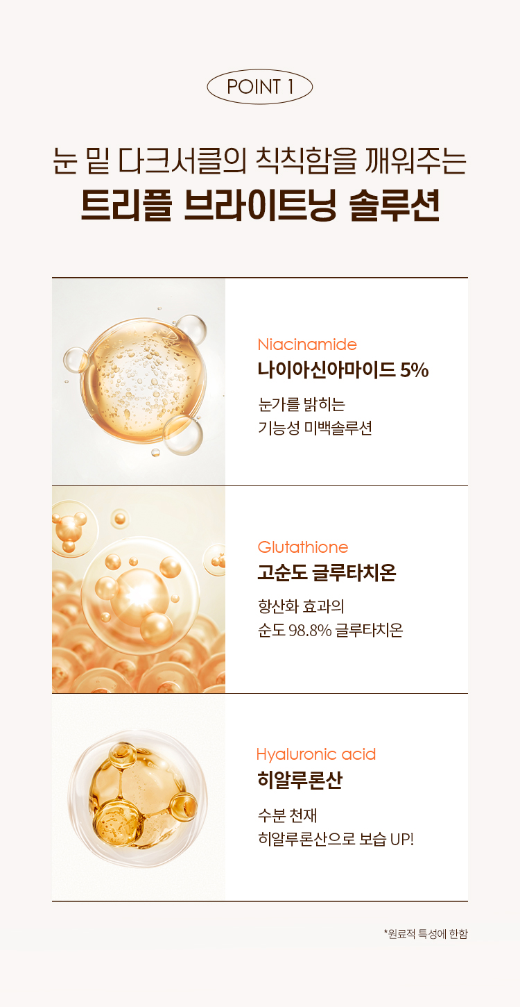 | 전성분 | 정제수, 메틸프로판다이올, 나이아신아마이드(5%), 글리세린, 카프릴릭/카프릭트라이글리세라이드, 폴리글리세릴-3메틸글루코오스다이스테아레이트, 부틸렌글라이콜, 1,2-헥산다이올, 글리세릴스테아레이트, 네오펜틸글라이콜다이헵타노에이트, 베타인, 베헤닐알코올, 비닐다이메티콘, 황련뿌리추출물, 소듐폴리아크릴로일다이메틸타우레이트, 하이드록시아세토페논, 팔미틱애씨드, 스테아릭애씨드, 다이프로필렌글라이콜, 에틸헥실글리세린, 다시마추출물, 한련초잎추출물, 마이크로크리스탈린셀룰로오스, 향료, 소듐스테아로일글루타메이트, 아데노신, 다이소듐이디티에이, 메틸다이아이소프로필프로피온아마이드, 프룩토올리고사카라이드, 셀룰로오스검, 베타-글루칸, 하이드로제네이티드레시틴, 감추출물, 사이아노코발아민, 하이드롤라이즈드하이알루로닉애씨드, 토코페롤, 글루타티온 |